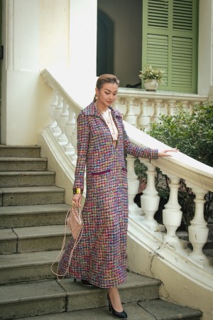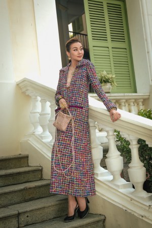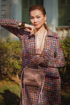 Vừa trở về từ chuyến đi Thái Lan ngắn ngày, Thanh Hằng xuất hiện đầy năng lượng tại sự kiện. Cô diện nguyên ‘cây’ Chanel, với điểm nhấn là bộ trang phục vải tweet xẻ ngực sâu đến tận rốn. Là người có kinh nghiệm, Thanh Hằng không gặp sự cố gì với bộ cánh gợi cảm này. “Nhìn sexy thế thôi chứ tôi ‘thủ’ an toàn hết rồi, cộng thêm chú ý một chút là mọi thứ đều ổn“, Thanh Hằng nói. “Vũ khí” giúp Thanh Hằng trở nên tự tin hơn khi mặc bộ váy xẻ ngực sâu này chính là chiếc mặt dây chuyền to.