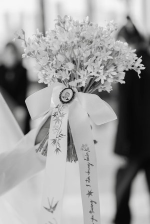 Từ chi tiết này cho thấy, Minh Tú mong muốn trong giây phút trọng đại của cuộc đời luôn có bố dõi theo và chúc phúc. Hình ảnh bó hoa cưới đặc biệt khiến nhiều người không khỏi xúc động. Trước đó, Minh Tú cũng yêu cầu dresscode trong buổi tiệc cưới dành cho các khách mời là màu đen như cách tưởng nhớ về bố mình.