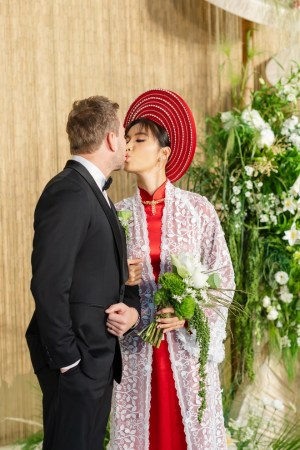Nhiều sao Việt như: Trường Giang – Nhã Phương, Puka – Gin Tuấn Kiệt, Khả Như, Hoa hậu Thiên Ân, Hoa hậuHương Giang, Đức Phúc, Erik… đã có mặt từ sớm để chúc mừng cho nàng siêu mẫu. Minh Tú diện áo dài truyền thống hôn say đắm chú rể Tây của mình khiến ai nấy như hạnh phúc lây.